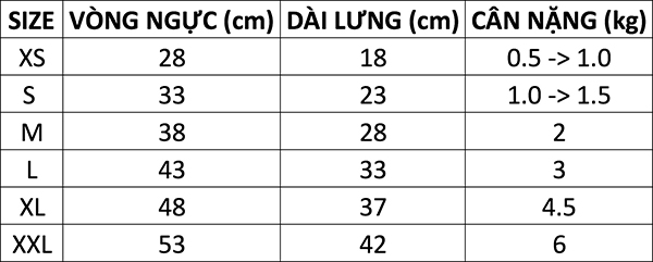 Bảng size (có thể chênh lệch 1-3 cm tuỳ cách đo)