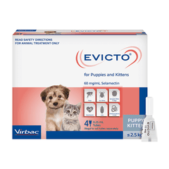 - Ngăn ngừa bệnh giun tim do Dirofilaria immitis khi dùng thuốc định kì hàng tháng. Tuy nhiên, thú cưng cũng cần được kiểm tra định kỳ giun tim ngay cả khi đang sử dụng sản phẩm. Evicto không có tác dụng với Giun tim trưởng thành.